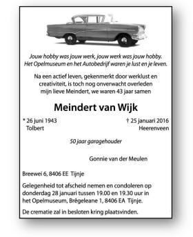 overlijdensadvertentie in de krant stond een Opel afgebeeld, een Rekord P1, met